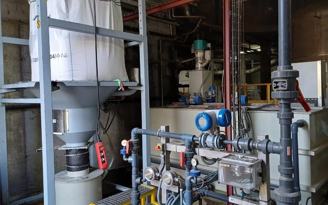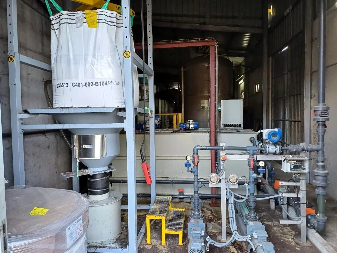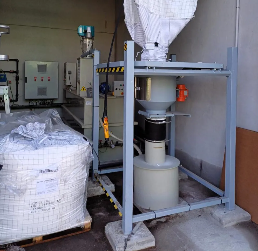 El cargador automático detecta la falta de producto en la tolva dosificadora de los preparadores automáticos de polielectrolito y en ese momento comienzan el proceso de carga, aspirando desde un depósito pulmón.